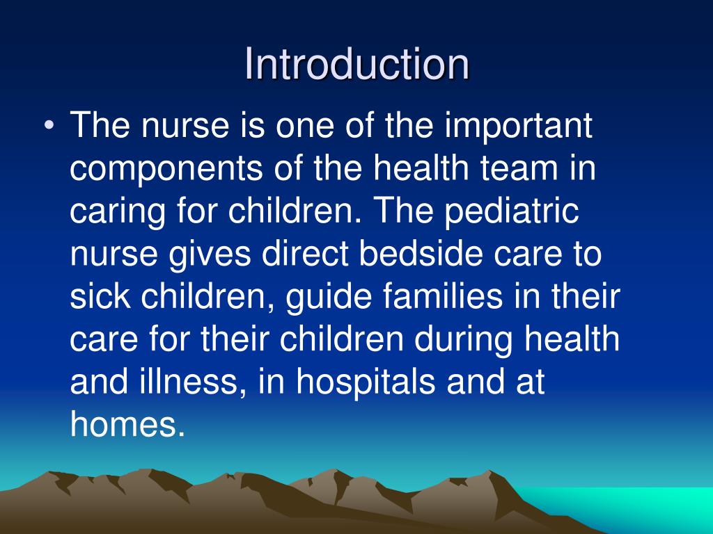Introduction • The nurse is one of the important components of the health team in caring for children. The pediatric nurse gives direct bedside care to sick children, guide families in their care for their children during health and illness, in hospitals and at homes.