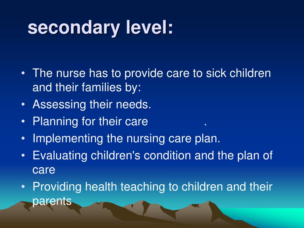 secondary level: • The nurse has to provide care to sick children and their families by: • Assessing their needs. • Planning for their care . • Implementing the nursing care plan. • Evaluating children's condition and the plan of care • Providing health teaching to children and their parents