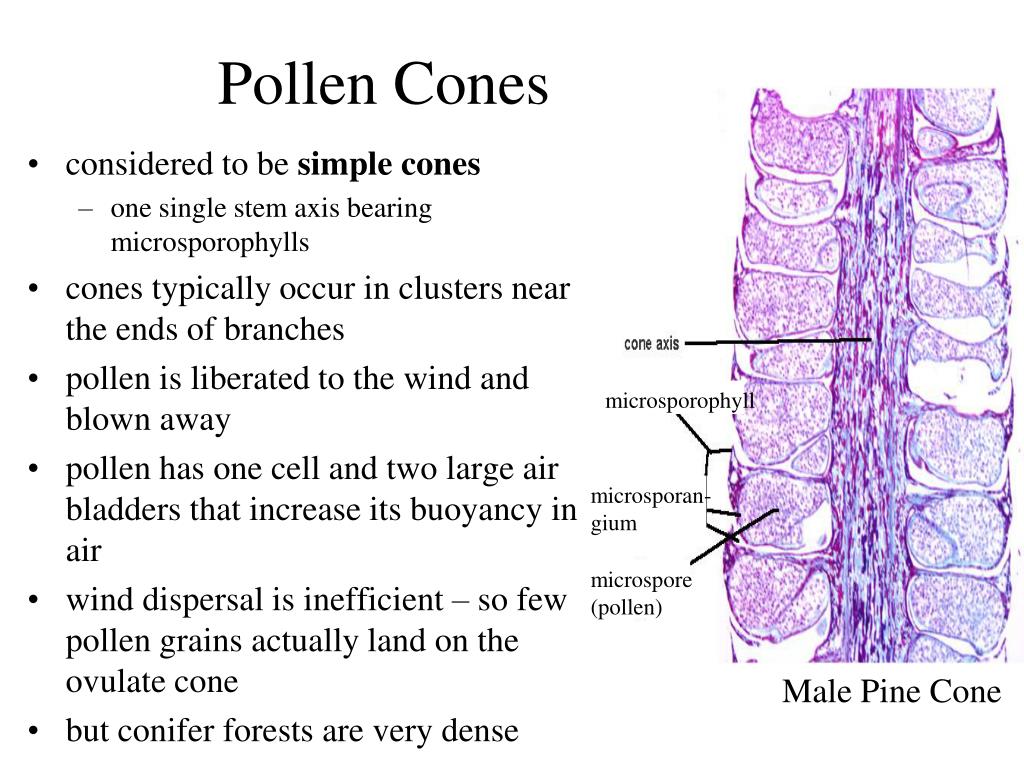 Pollen Cones • considered to be simple cones • one single stem axis bearing microsporophylls • cones typically occur in clusters near the ends of branches • pollen is liberated to the wind and blown away • pollen has one cell and two large air bladders that increase its buoyancy in air • wind dispersal is inefficient – so few pollen grains actually land on the ovulate cone • but conifer forests are very dense microsporophyll microsporan- gium microspore (pollen) Male Pine Cone