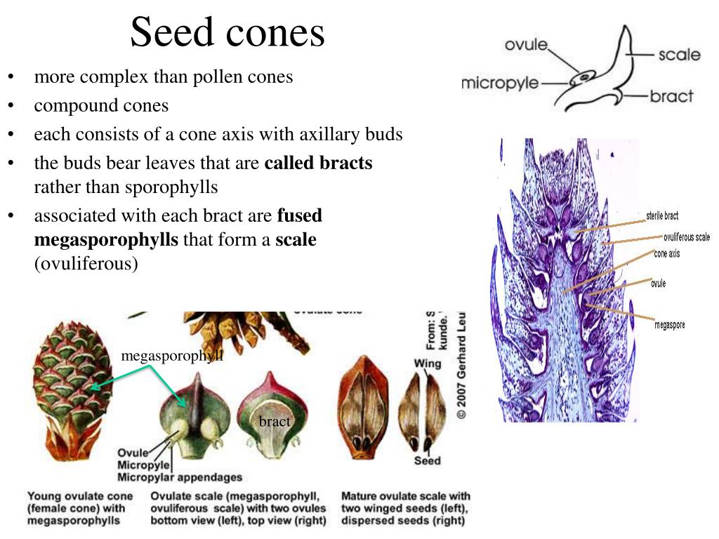 Seed cones • more complex than pollen cones • compound cones • each consists of a cone axis with axillary buds • the buds bear leaves that are called bracts rather than sporophylls • associated with each bract are fused megasporophyllsthat form a scale (ovuliferous) megasporophyll bract
