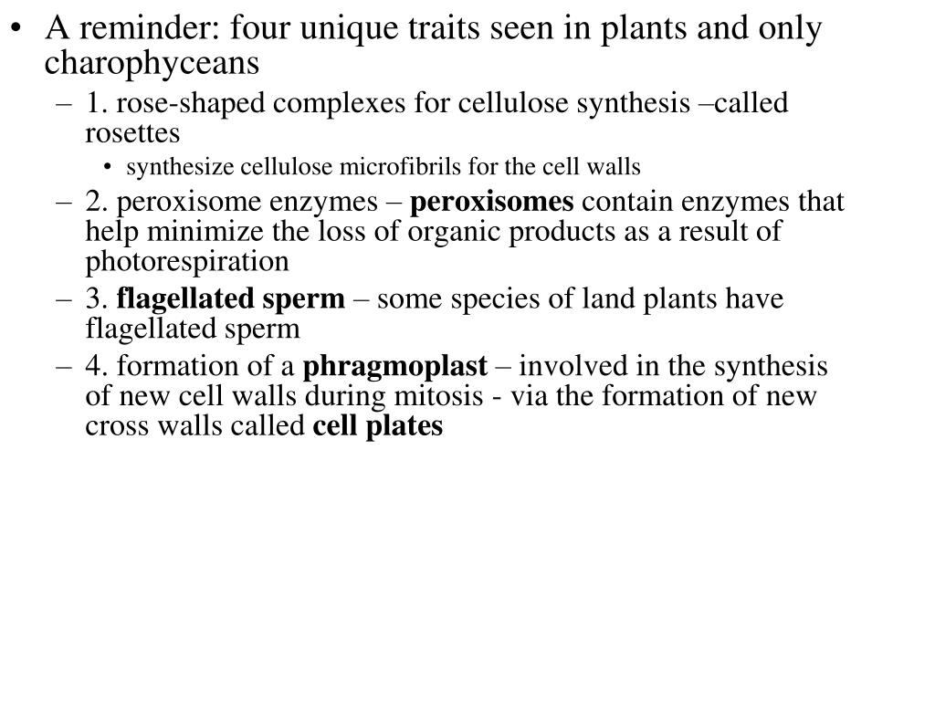 A reminder: four unique traits seen in plants and only charophyceans • 1. rose-shaped complexes for cellulose synthesis –called rosettes • synthesize cellulose microfibrils for the cell walls • 2. peroxisome enzymes – peroxisomes contain enzymes that help minimize the loss of organic products as a result of photorespiration • 3. flagellated sperm – some species of land plants have flagellated sperm • 4. formation of a phragmoplast– involved in the synthesis of new cell walls during mitosis - via the formation of new cross walls called cell plates