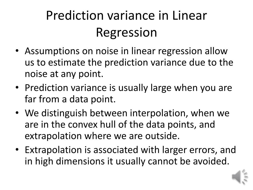 Prediction variance in Linear Regression. Assumptions on noise in linear regression allow us to estimate the prediction variance due to the noise at any point. Prediction variance is usually large when you are far from a data point.