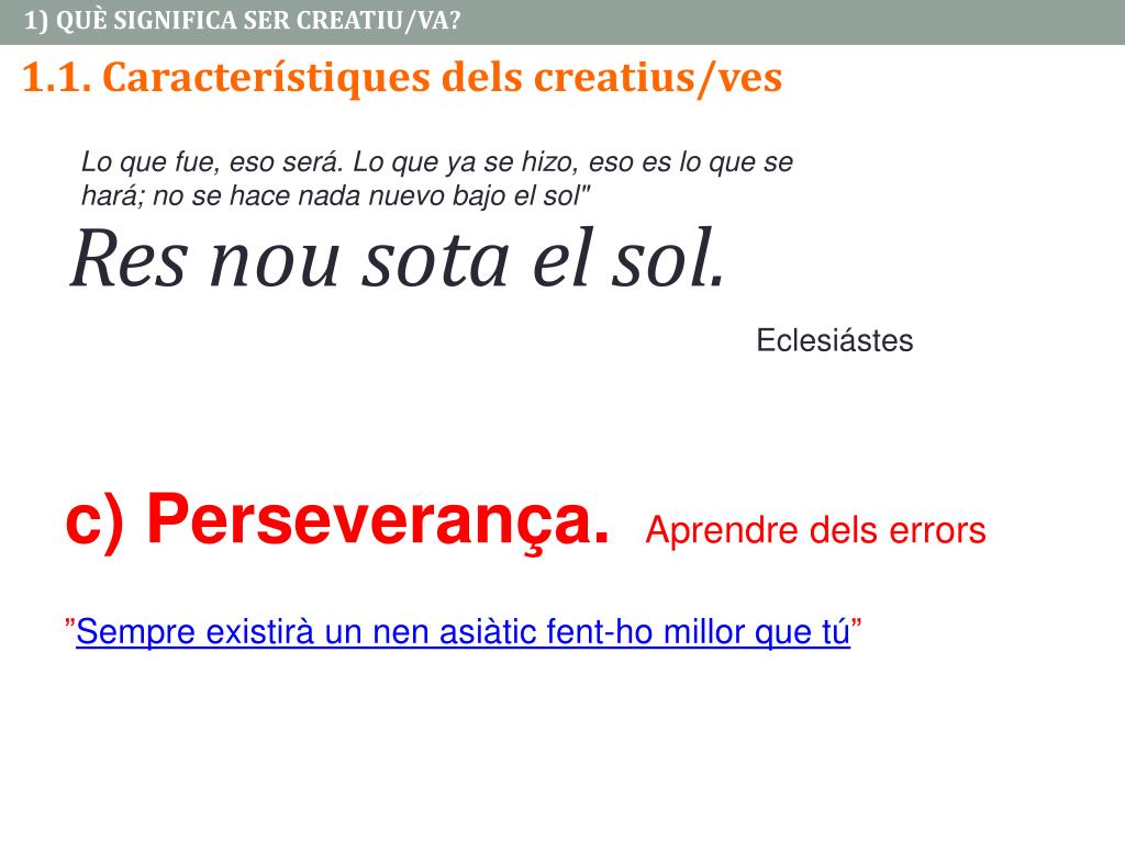 1) QUÈ SIGNIFICA SER CREATIU/VA? 1.1. Característiques dels creatius/ves Lo que fue, eso será. Lo que ya se hizo, eso es lo que se hará; no se hace nada nuevo bajo el sol" Res nou sota el sol. Eclesiástes c) Perseverança. Aprendre dels errors ”Sempre existiràunnenasiàticfent-ho millorquetú”