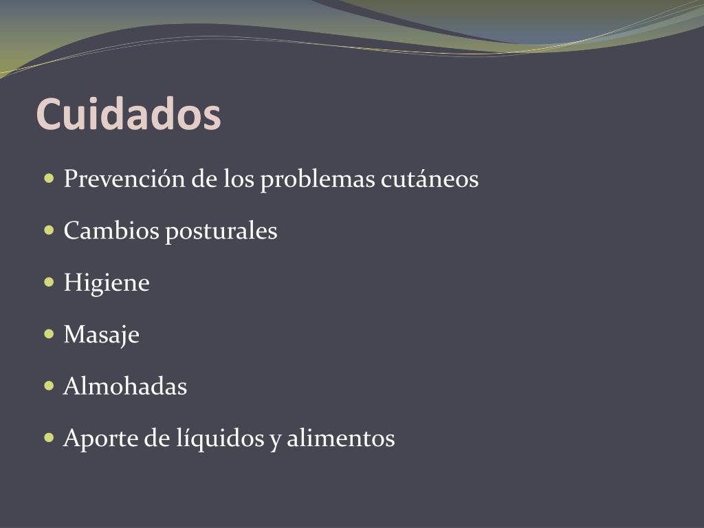 Cuidados • Prevención de los problemas cutáneos • Cambios posturales • Higiene • Masaje • Almohadas • Aporte de líquidos y alimentos