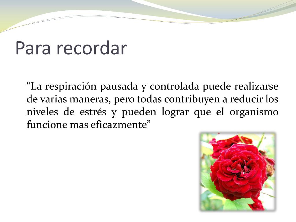 Para recordar “La respiración pausada y controlada puede realizarse de varias maneras, pero todas contribuyen a reducir los niveles de estrés y pueden lograr que el organismo funcione mas eficazmente”