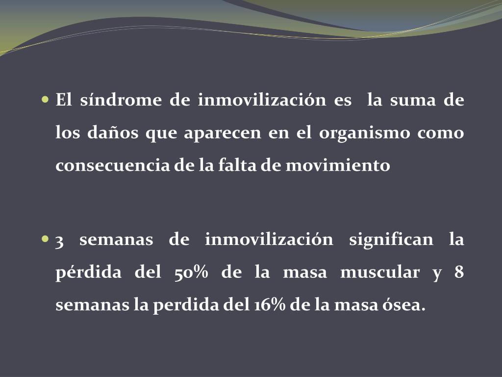 El síndrome de inmovilización es la suma de los daños que aparecen en el organismo como consecuencia de la falta de movimiento • 3 semanas de inmovilización significan la pérdida del 50% de la masa muscular y 8 semanas la perdida del 16% de la masa ósea.