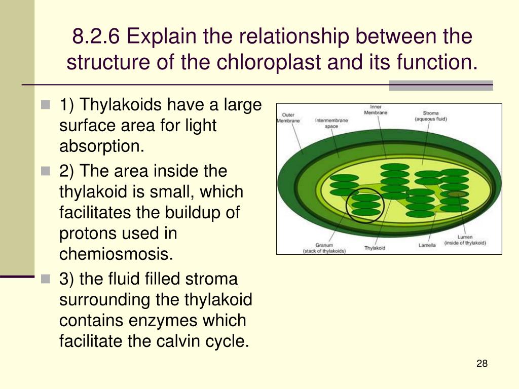 8.2.6 Explain the relationship between the structure of the chloroplast and its function. • 1) Thylakoids have a large surface area for light absorption. • 2) The area inside the thylakoid is small, which facilitates the buildup of protons used in chemiosmosis. • 3) the fluid filled stroma surrounding the thylakoid contains enzymes which facilitate the calvin cycle.