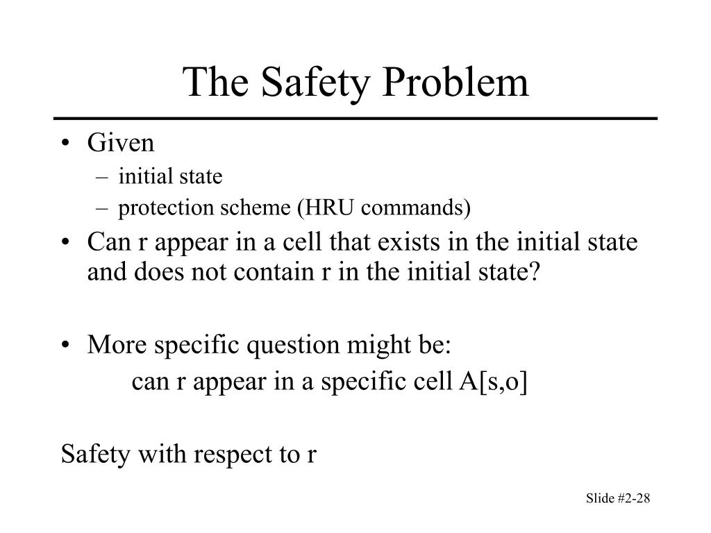 The Safety Problem • Given • initial state • protection scheme (HRU commands) • Can r appear in a cell that exists in the initial state and does not contain r in the initial state? • More specific question might be: can r appear in a specific cell A[s,o] Safety with respect to r