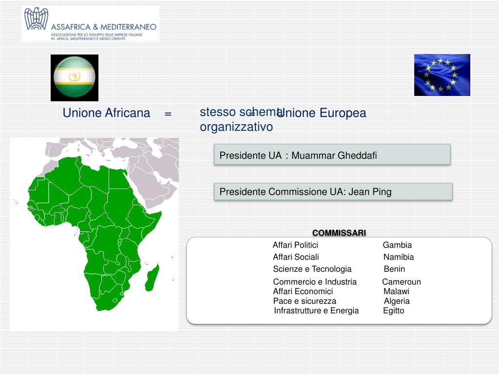 stesso schema organizzativo Unione Africana = = Unione Europea Presidente UA:Muammar Gheddafi Presidente Commissione UA: Jean Ping