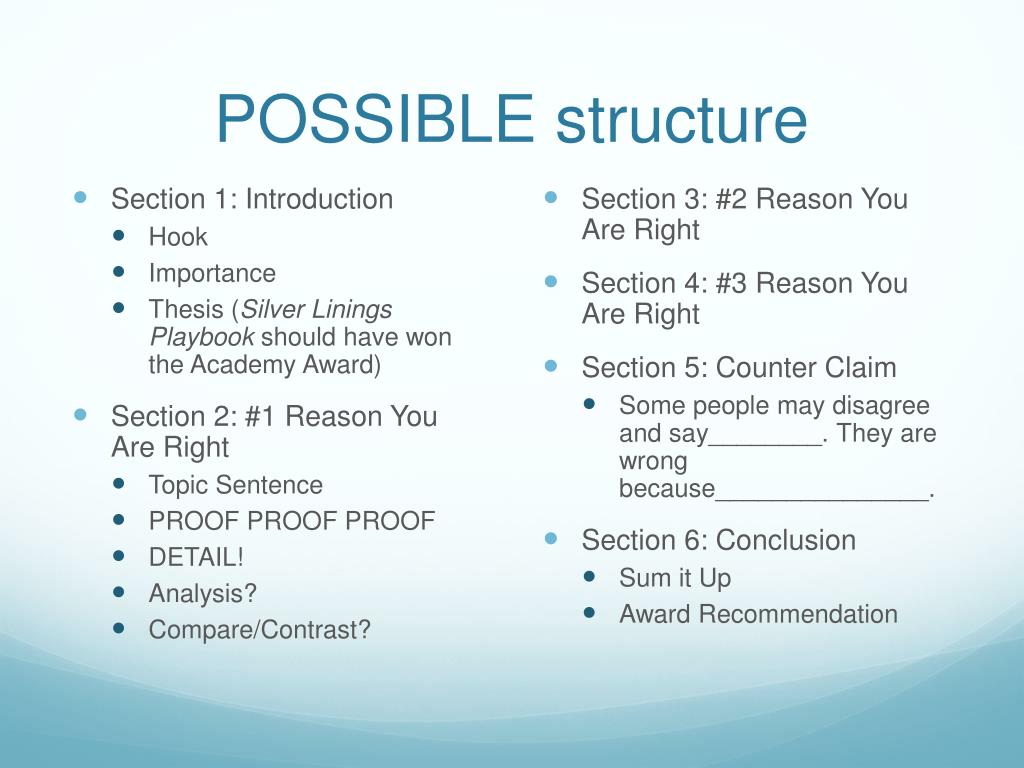 POSSIBLE structure • Section 1: Introduction • Hook • Importance • Thesis (Silver Linings Playbook should have won the Academy Award) • Section 2: #1 Reason You Are Right • Topic Sentence • PROOF PROOF PROOF • DETAIL! • Analysis? • Compare/Contrast? • Section 3: #2 Reason You Are Right • Section 4: #3 Reason You Are Right • Section 5: Counter Claim • Some people may disagree and say________. They are wrong because_______________. • Section 6: Conclusion • Sum it Up • Award Recommendation