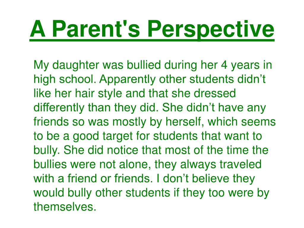 A Parent's Perspective My daughter was bullied during her 4 years in high school. Apparently other students didn’t like her hair style and that she dressed differently than they did. She didn’t have any friends so was mostly by herself, which seems to be a good target for students that want to bully. She did notice that most of the time the bullies were not alone, they always traveled with a friend or friends. I don’t believe they would bully other students if they too were by themselves.