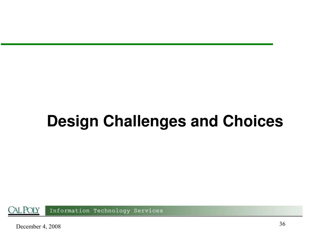 Design Choices – SCD Example • Cal Poly needs department tree history • Department tree data • Slowly Changing Dimension Type 2 - preserves history • Effective date rows (effective from and to dates) • Add new row for each change • All other department attributes • Slowly Changing Dimension Type 1 – overwrites history • Replace old/outdated data with current