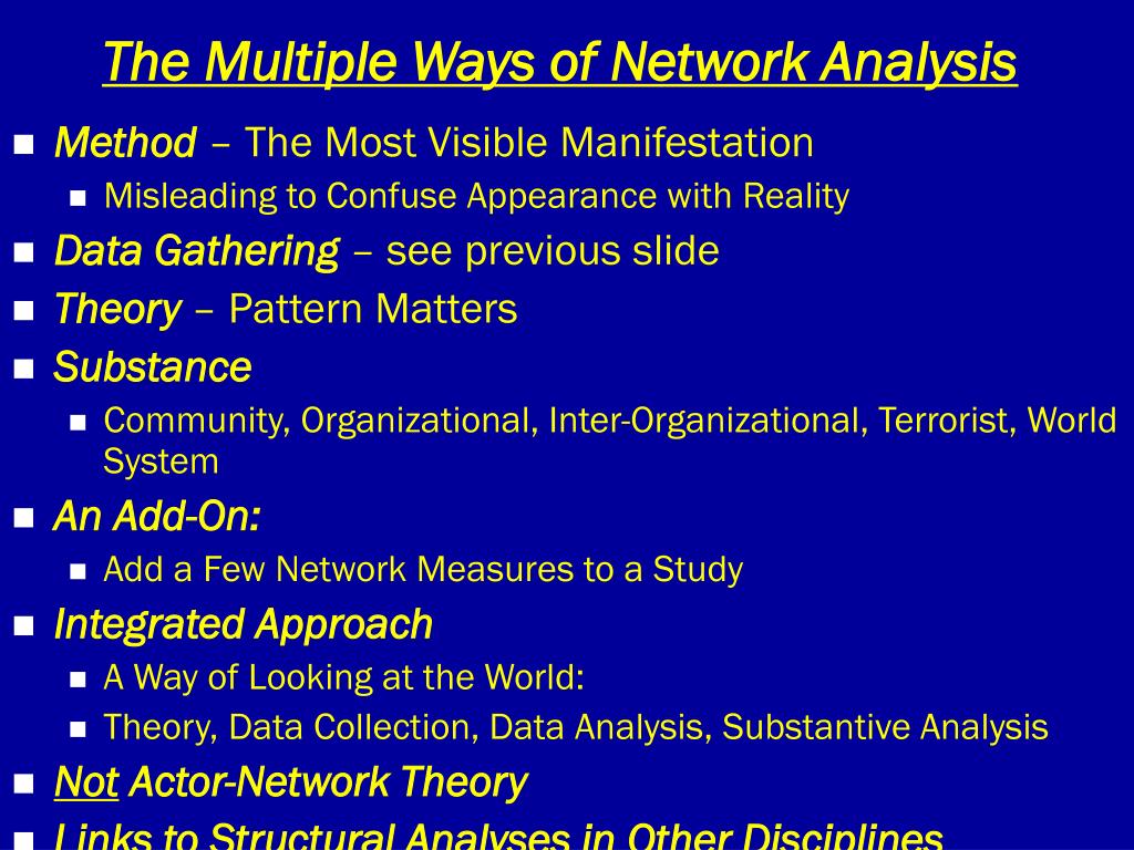 The Multiple Ways of Network Analysis • Method – The Most Visible Manifestation • Misleading to Confuse Appearance with Reality • Data Gathering – see previous slide • Theory – Pattern Matters • Substance • Community, Organizational, Inter-Organizational, Terrorist, World System • An Add-On: • Add a Few Network Measures to a Study • Integrated Approach • A Way of Looking at the World: • Theory, Data Collection, Data Analysis, Substantive Analysis • Not Actor-Network Theory • Links to Structural Analyses in Other Disciplines