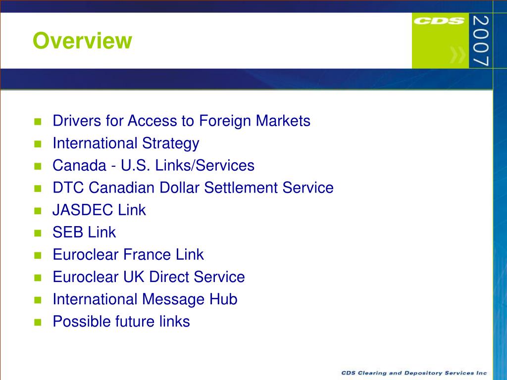 ACSDA Leadership Forum. CDS International Links. Overview. Drivers for Access to Foreign Markets International Strategy Canada - U.S. Links/Services DTC Canadian Dollar Settlement Service JASDEC Link SEB Link Euroclear France Link Euroclear UK Direct Service International Message Hub