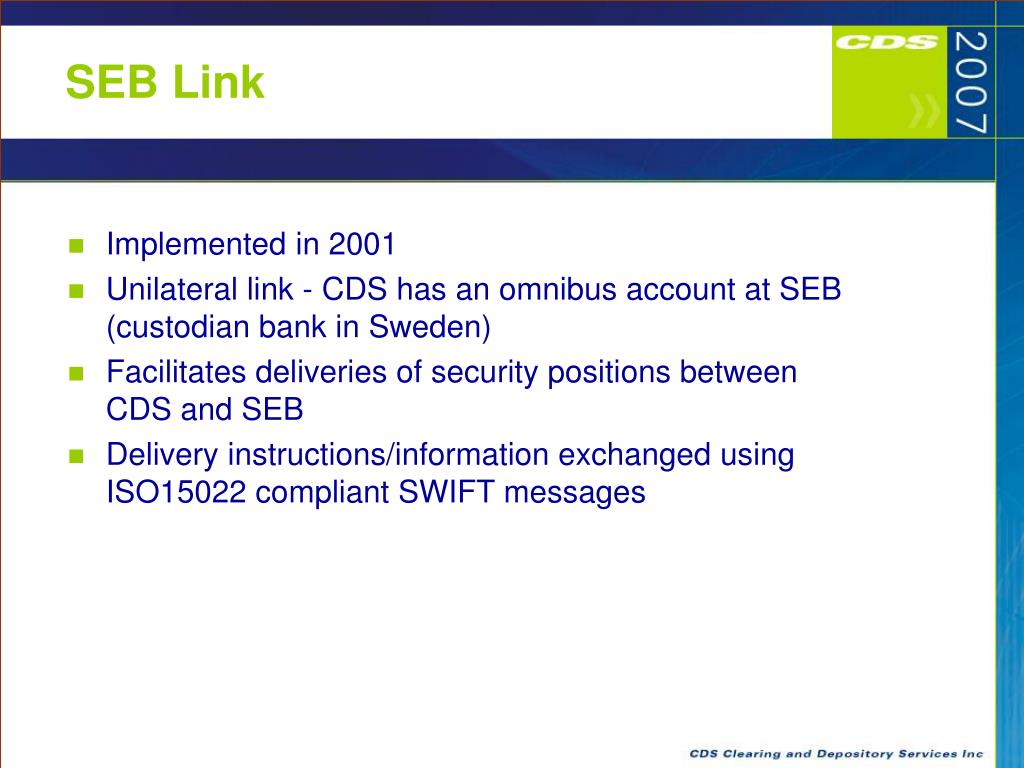 SEB Link • Implemented in 2001 • Unilateral link - CDS has an omnibus account at SEB (custodian bank in Sweden) • Facilitates deliveries of security positions between CDS and SEB • Delivery instructions/information exchanged using ISO15022 compliant SWIFT messages