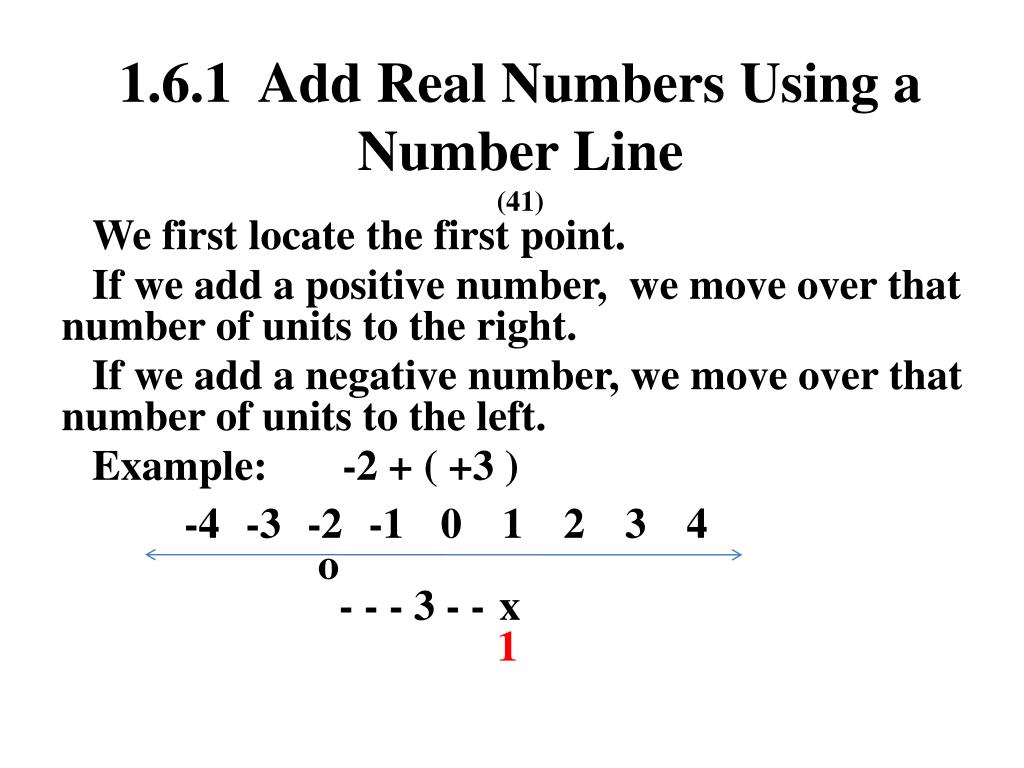 1.6.1 Add Real Numbers Using a Number Line(41) We first locate the first point. If we add a positive number, we move over that number of units to the right. If we add a negative number, we move over that number of units to the left. Example: -2 + ( +3 ) -4 -3 -2 -1 0 1 2 3 4 o - - - 3 - -x 1