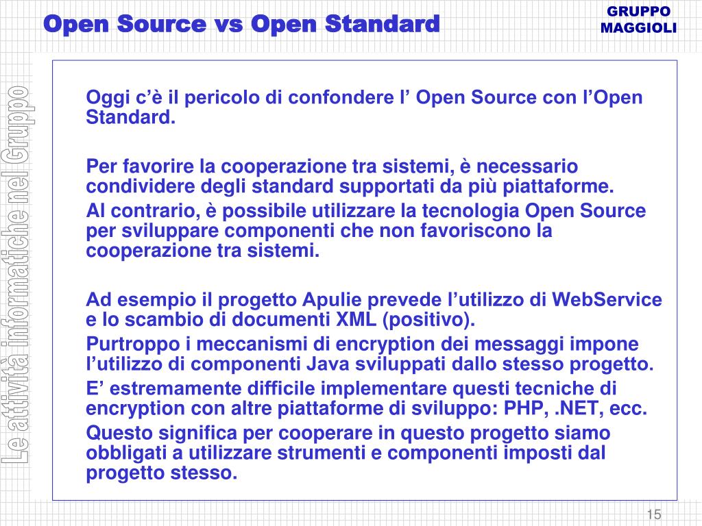Open Source vs Open Standard Oggi c’è il pericolo di confondere l’ Open Source con l’Open Standard. Per favorire la cooperazione tra sistemi, è necessario condividere degli standard supportati da più piattaforme. Al contrario, è possibile utilizzare la tecnologia Open Source per sviluppare componenti che non favoriscono la cooperazione tra sistemi. Ad esempio il progetto Apulie prevede l’utilizzo di WebService e lo scambio di documenti XML (positivo). Purtroppo i meccanismi di encryption dei messaggi impone l’utilizzo di componenti Java sviluppati dallo stesso progetto. E’ estremamente difficile implementare questi tecniche di encryption con altre piattaforme di sviluppo: PHP, .NET, ecc. Questo significa per cooperare in questo progetto siamo obbligati a utilizzare strumenti e componenti imposti dal progetto stesso.