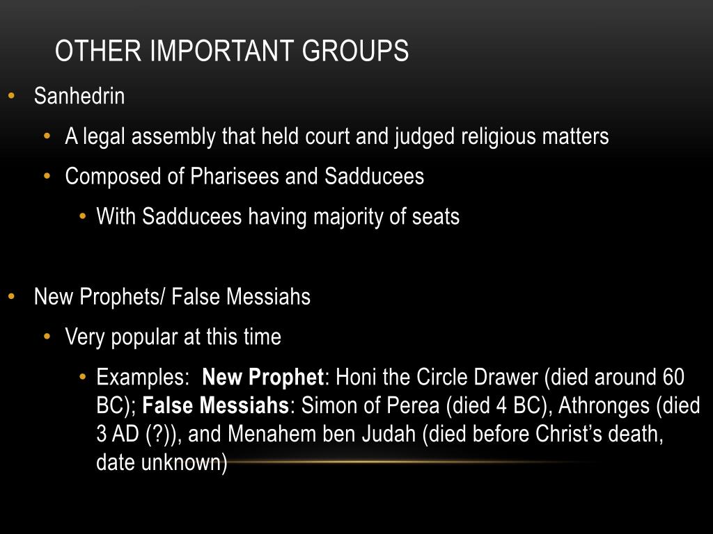 Other Important Groups • Sanhedrin • A legal assembly that held court and judged religious matters • Composed of Pharisees and Sadducees • With Sadducees having majority of seats • New Prophets/ False Messiahs • Very popular at this time • Examples: New Prophet: Honi the Circle Drawer (died around 60 BC); False Messiahs: Simon of Perea (died 4 BC), Athronges (died 3 AD (?)), and Menahem ben Judah (died before Christ’s death, date unknown)