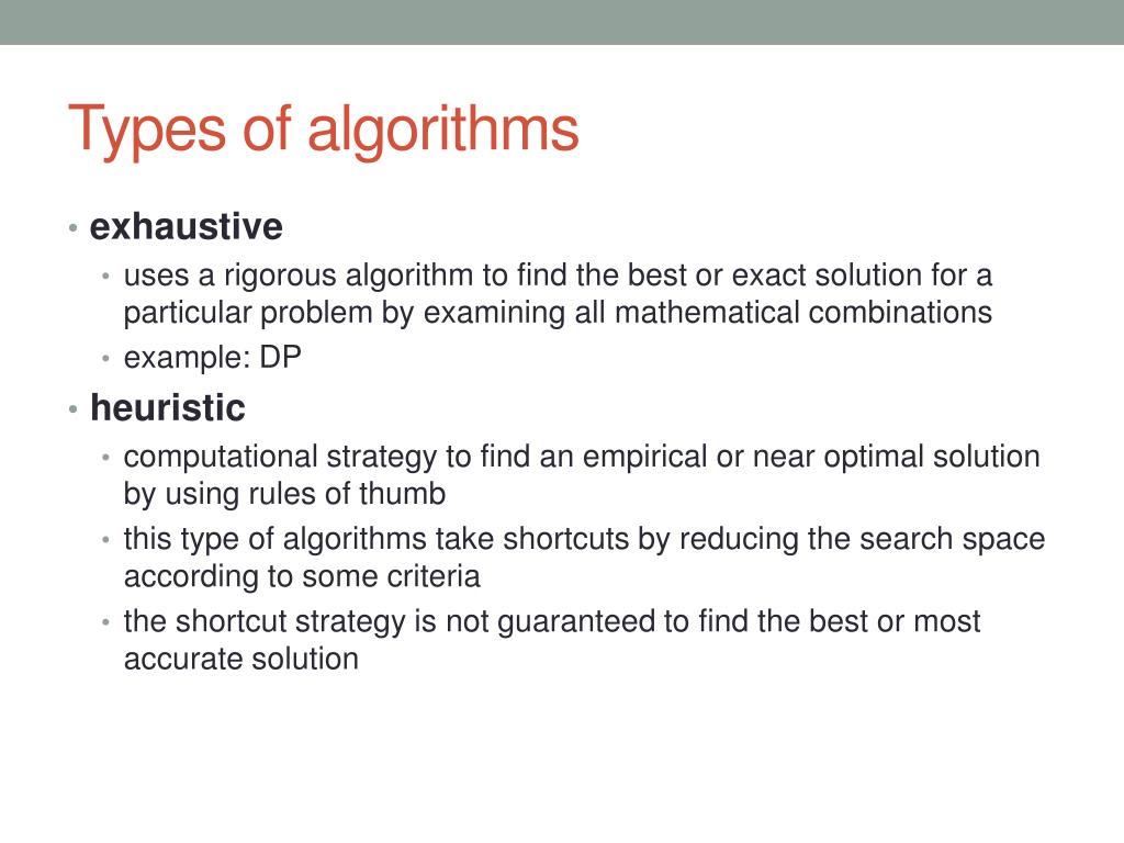 Types of algorithms • exhaustive • uses a rigorous algorithm to find the best or exact solution for a particular problem by examining all mathematical combinations • example: DP • heuristic • computational strategy to find an empirical or near optimal solution by using rules of thumb • this type of algorithms take shortcuts by reducing the search space according to some criteria • the shortcut strategy is not guaranteed to find the best or most accurate solution