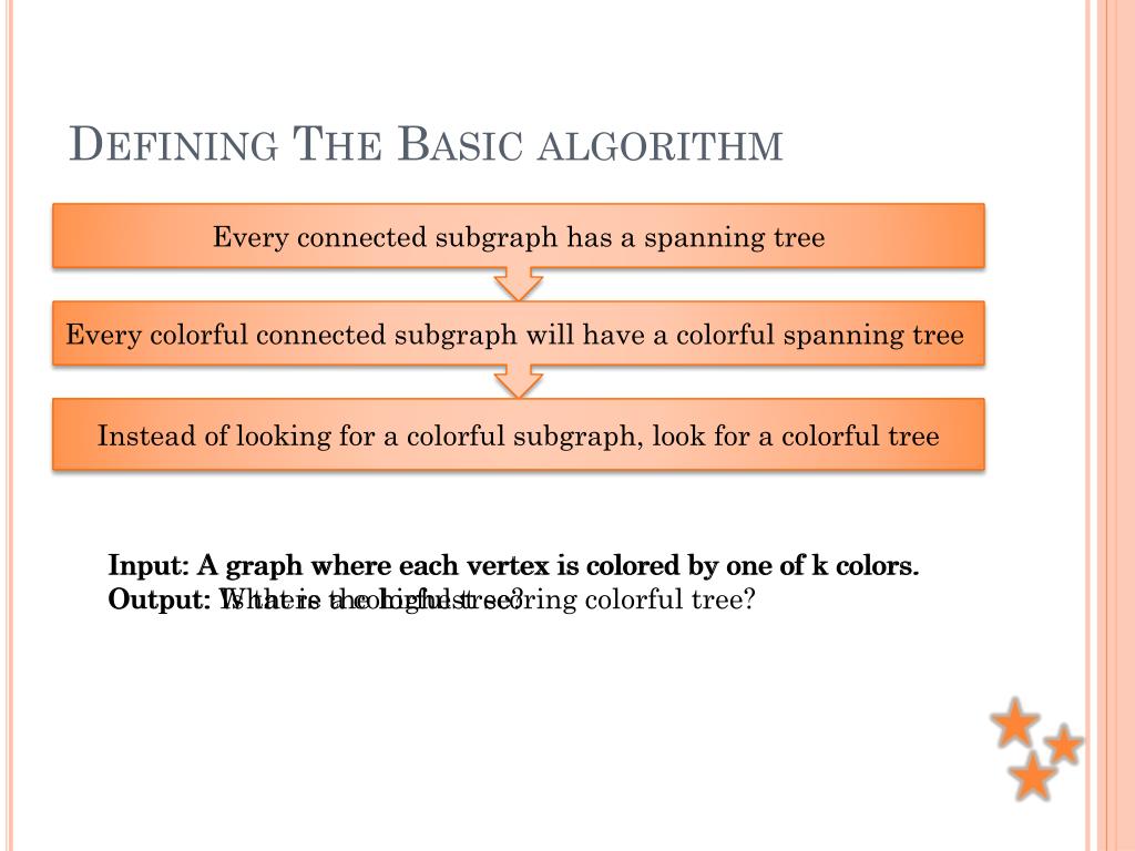 Defining The Basic algorithm Every connected subgraph has a spanning tree Every colorful connected subgraph will have a colorful spanning tree Instead of looking for a colorful subgraph, look for a colorful tree Input: A graph where each vertex is colored by one of k colors. Output: Is there a colorful tree? Input: A graph where each vertex is colored by one of k colors. Output: What is the highest scoring colorful tree?