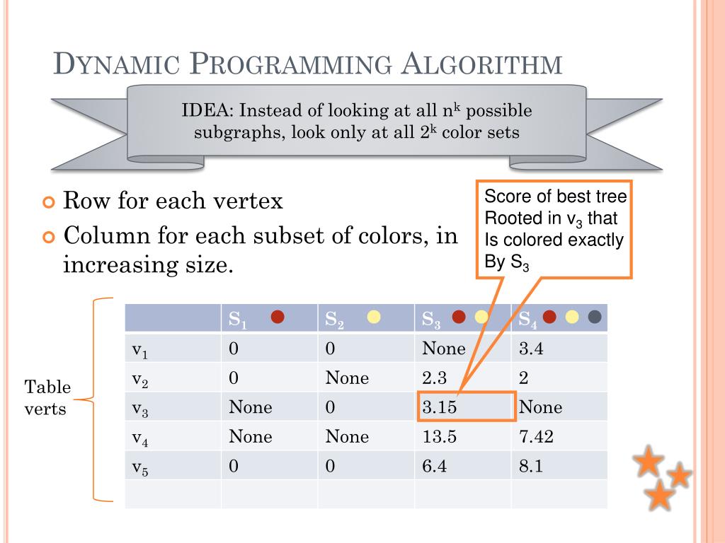 Dynamic Programming Algorithm IDEA: Instead of looking at all nk possible subgraphs, look only at all 2k color sets • Row for each vertex • Column for each subset of colors, in increasing size. Score of best tree Rooted in v3 that Is colored exactly By S3 Table verts