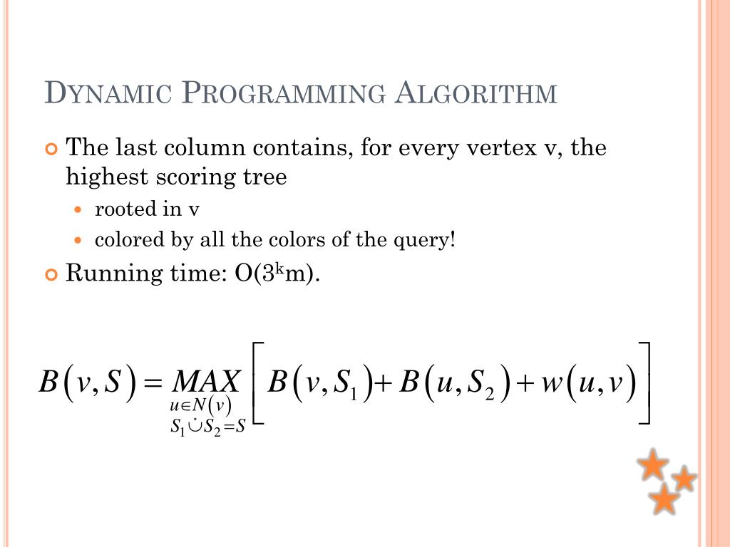 Dynamic Programming Algorithm • The last column contains, for every vertex v, the highest scoring tree • rooted in v • colored by all the colors of the query! • Running time: O(3km).
