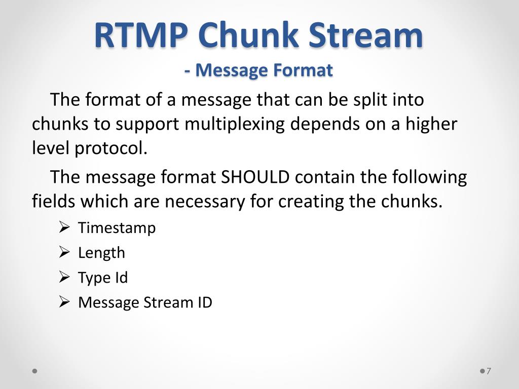 RTMP Chunk Stream- Message Format The format of a message that can be split into chunks to support multiplexing depends on a higher level protocol. The message format SHOULD contain the following fields which are necessary for creating the chunks. • Timestamp • Length • Type Id • Message Stream ID