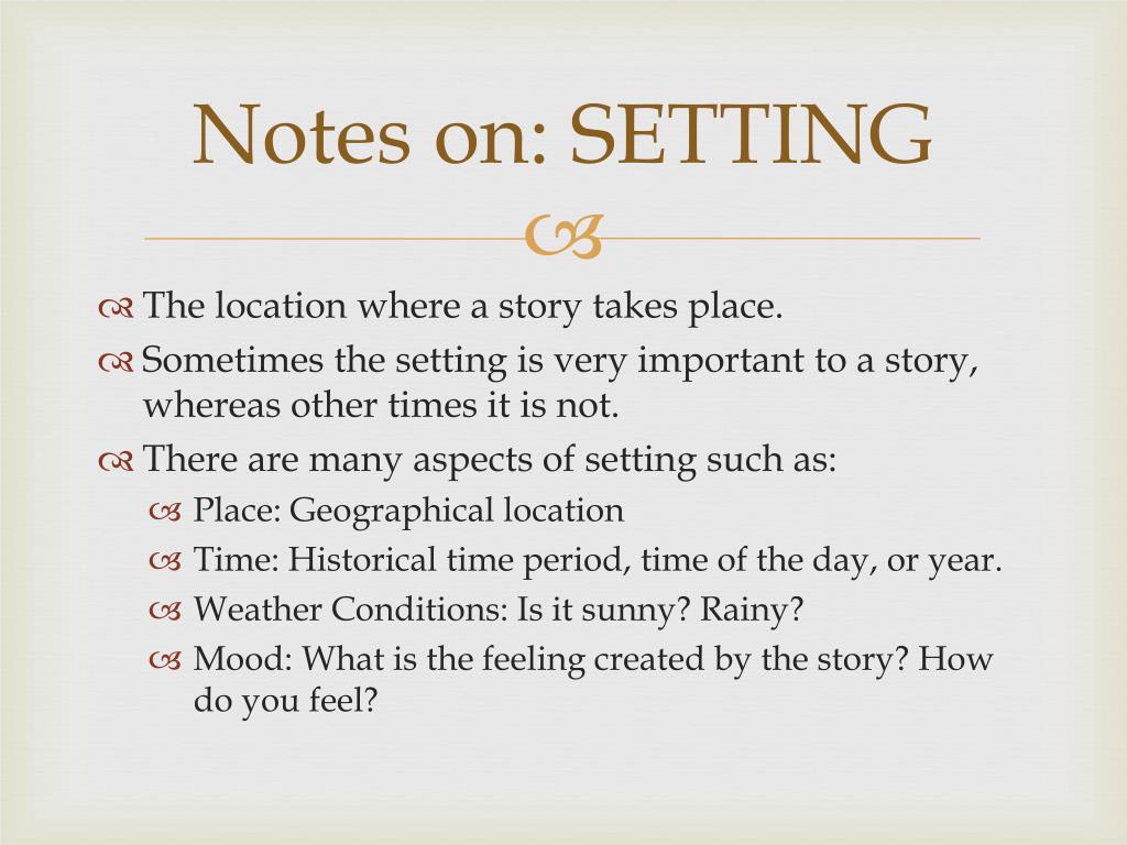 Notes on: SETTING • The location where a story takes place. • Sometimes the setting is very important to a story, whereas other times it is not. • There are many aspects of setting such as: • Place: Geographical location • Time: Historical time period, time of the day, or year. • Weather Conditions: Is it sunny? Rainy? • Mood: What is the feeling created by the story? How do you feel?