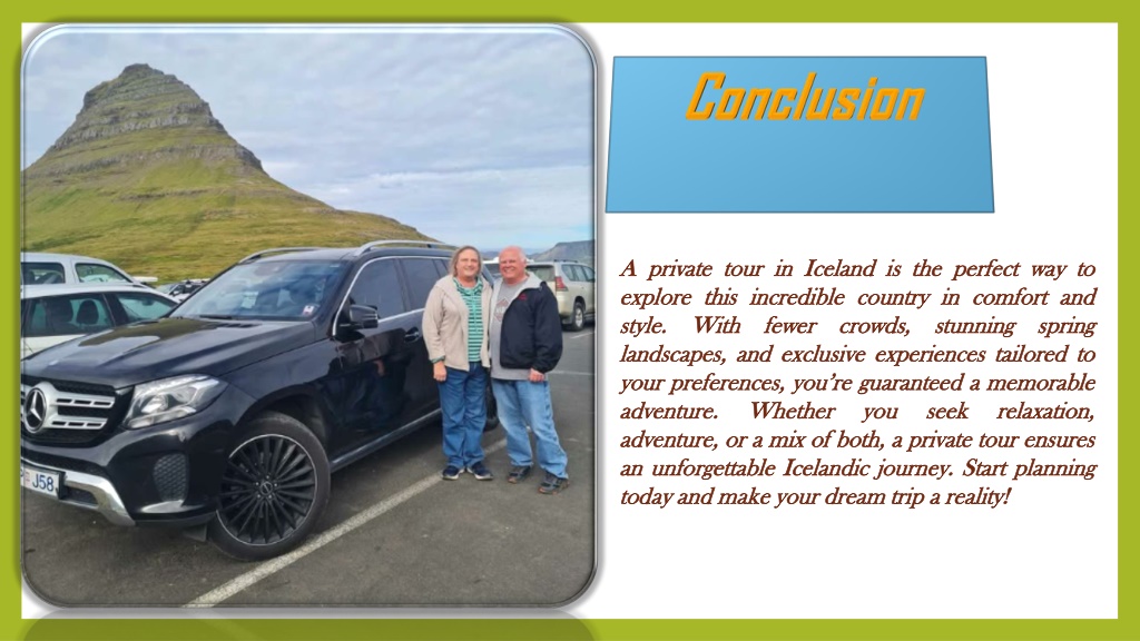 Conclusion A private tour in Iceland is the perfect way to explore this incredible country in comfort and style. With fewer crowds, stunning spring landscapes, and exclusive experiences tailored to your preferences, you’re guaranteed a memorable adventure. Whether you seek relaxation, adventure, or a mix of both, a private tour ensures an unforgettable Icelandic journey. Start planning today and make your dream trip a reality!