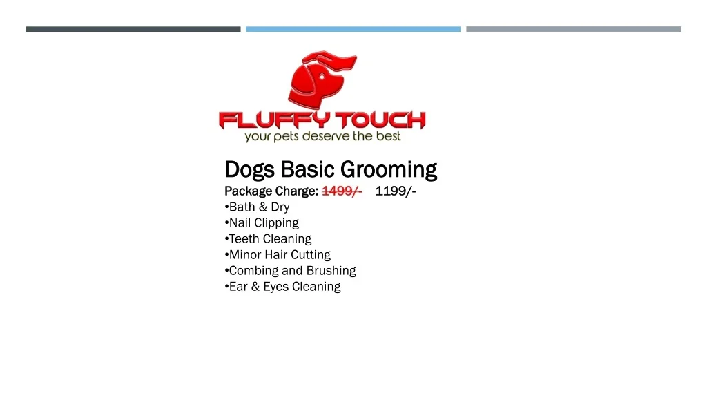 Dogs Basic Grooming Dogs Basic Grooming Package Charge: Package Charge: 1499/ 1499/- - •Bath & Dry •Nail Clipping •Teeth Cleaning •Minor Hair Cutting •Combing and Brushing •Ear & Eyes Cleaning 1199/ 1199/- -
