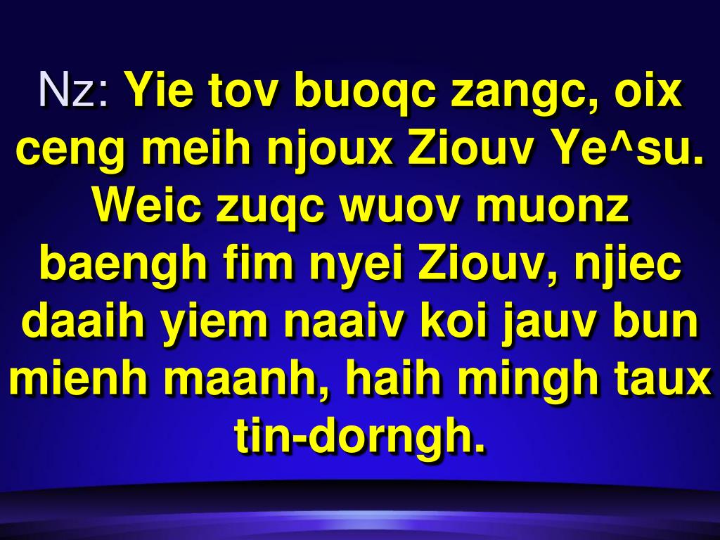Nz:Yie tov buoqc zangc, oix ceng meih njoux Ziouv Ye^su. Weic zuqc wuov muonz baengh fim nyei Ziouv, njiec daaih yiem naaiv koi jauv bun mienh maanh, haih mingh taux tin-dorngh.