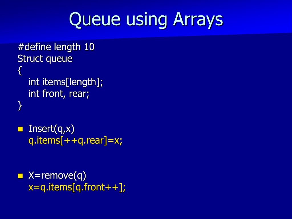 Queue using Arrays #define length 10 Struct queue { int items[length]; int front, rear; } • Insert(q,x) q.items[++q.rear]=x; • X=remove(q) x=q.items[q.front++];
