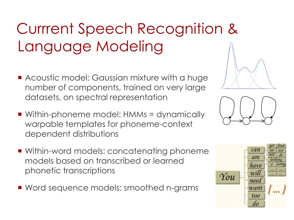 Currrent Speech Recognition & Language Modeling • Acoustic model: Gaussian mixture with a huge number of components, trained on very large datasets, on spectral representation • Within-phoneme model: HMMs = dynamically warpable templates for phoneme-context dependent distributions • Within-word models: concatenating phoneme models based on transcribed or learned phonetic transcriptions • Word sequence models: smoothed n-grams