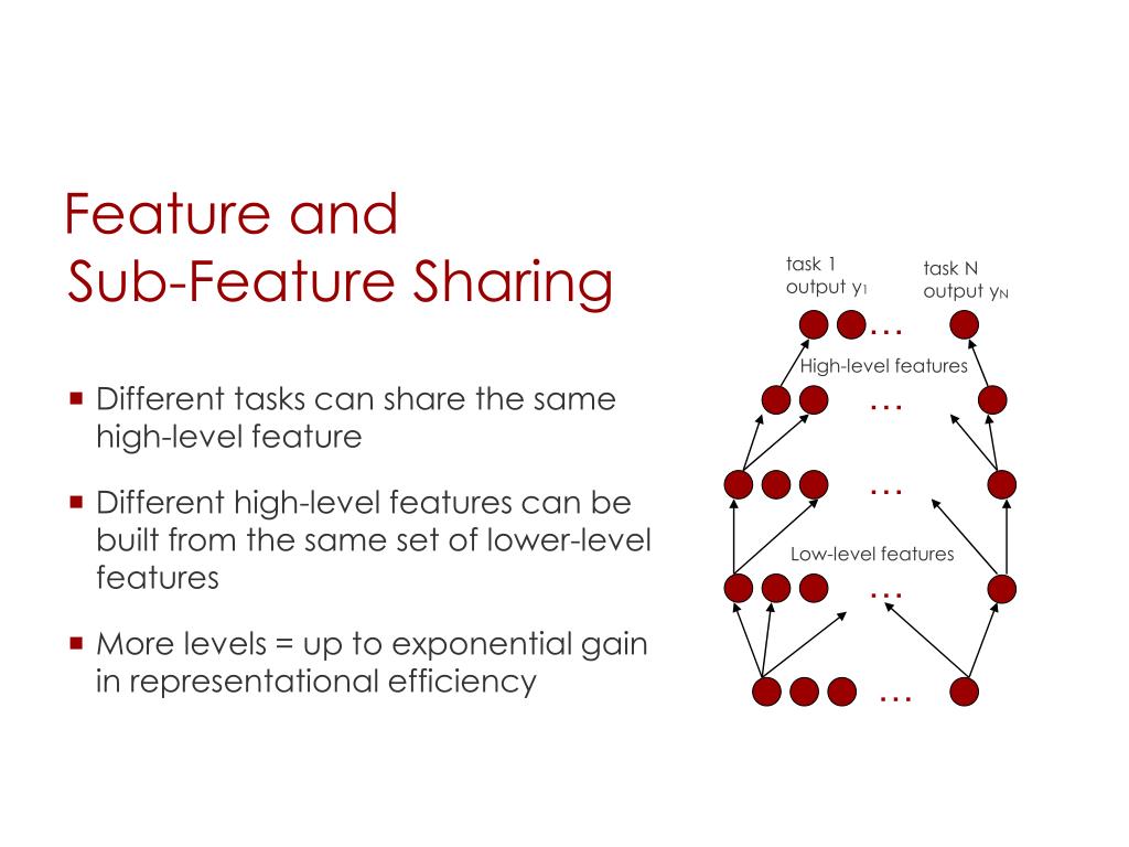 Feature andSub-Feature Sharing • Different tasks can share the same high-level feature • Different high-level features can be built from the same set of lower-level features • More levels = up to exponential gain in representational efficiency task 1 output y1 task N output yN … High-level features … … Low-level features … …