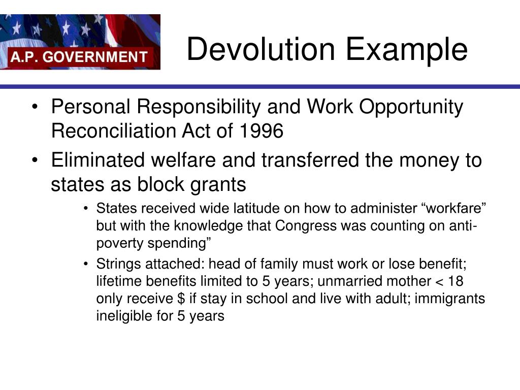 Devolution Example • Personal Responsibility and Work Opportunity Reconciliation Act of 1996 • Eliminated welfare and transferred the money to states as block grants • States received wide latitude on how to administer “workfare” but with the knowledge that Congress was counting on anti-poverty spending” • Strings attached: head of family must work or lose benefit; lifetime benefits limited to 5 years; unmarried mother < 18 only receive $ if stay in school and live with adult; immigrants ineligible for 5 years