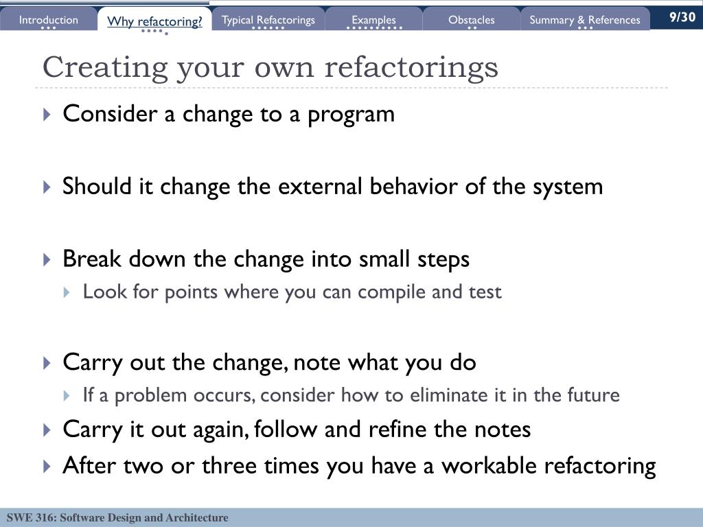 9/30 Introduction Why refactoring? Typical Refactorings Examples Obstacles Summary & References Creating your own refactorings • Consider a change to a program • Should it change the external behavior of the system • Break down the change into small steps • Look for points where you can compile and test • Carry out the change, note what you do • If a problem occurs, consider how to eliminate it in the future • Carry it out again, follow and refine the notes • After two or three times you have a workable refactoring