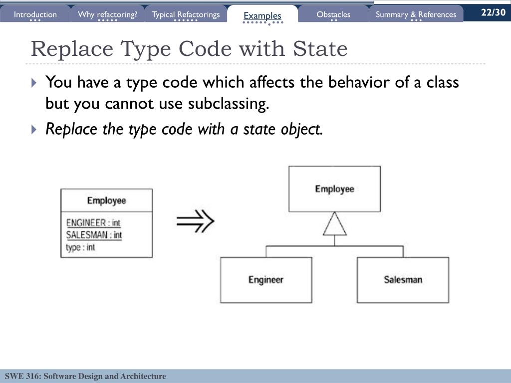 1 Employee Employee Type Employee ENGINEER : int SALESMAN : int type : int Engineer Salesman 22/30 Introduction Why refactoring? Typical Refactorings Examples Obstacles Summary & References Replace Type Code with State • You have a type code which affects the behavior of a class but you cannot use subclassing. • Replace the type code with a state object.