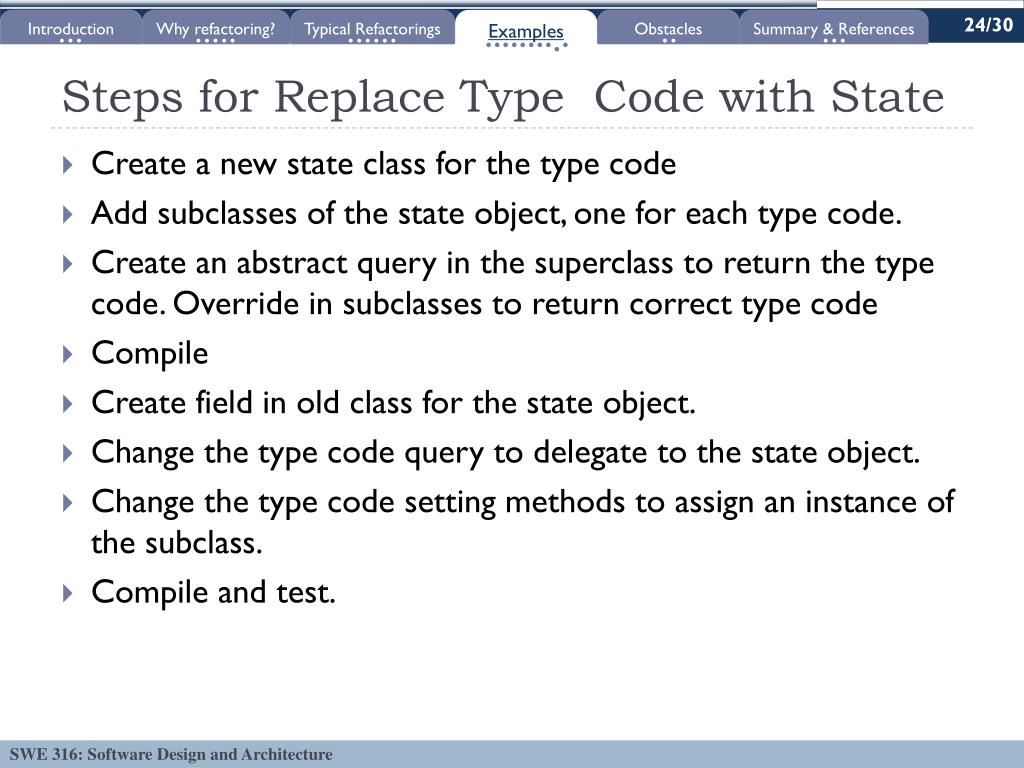 24/30 Introduction Why refactoring? Typical Refactorings Examples Obstacles Summary & References Steps for Replace Type Code with State • Create a new state class for the type code • Add subclasses of the state object, one for each type code. • Create an abstract query in the superclass to return the type code. Override in subclasses to return correct type code • Compile • Create field in old class for the state object. • Change the type code query to delegate to the state object. • Change the type code setting methods to assign an instance of the subclass. • Compile and test.
