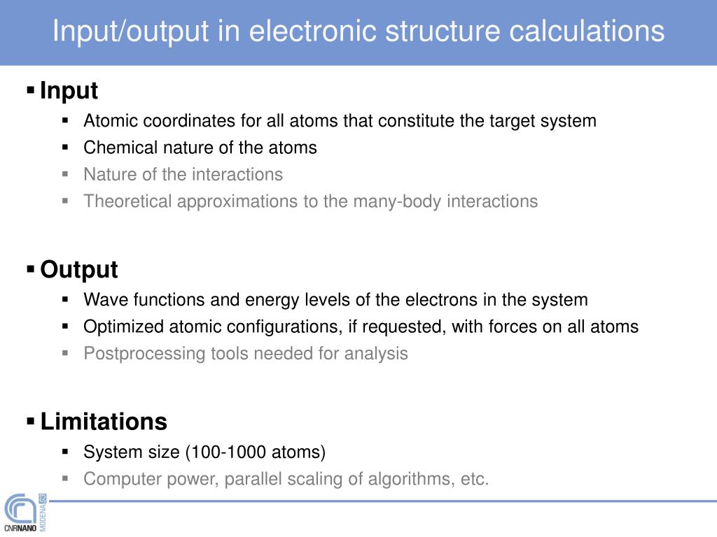 Input/output in electronic structure calculations Input Atomic coordinates for all atoms that constitute the target system Chemical nature of the atoms Nature of the interactions Theoretical approximations to the many-body interactions Output Wave functions and energy levels of the electrons in the system Optimized atomic configurations, if requested, with forces on all atoms Postprocessing tools needed for analysis Limitations System size (100-1000 atoms) Computer power, parallel scaling of algorithms, etc.