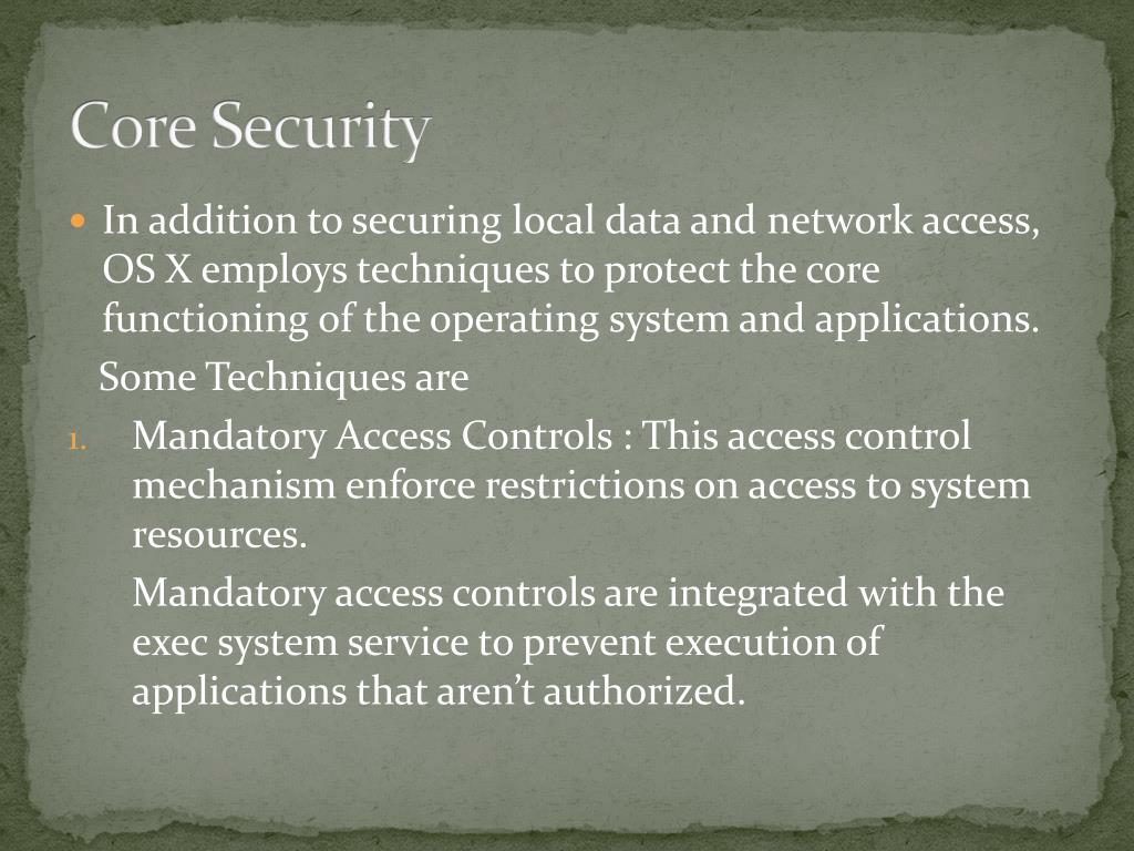 Core Security • In addition to securing local data and network access, OS X employs techniques to protect the core functioning of the operating system and applications. Some Techniques are • Mandatory Access Controls : This access control mechanism enforce restrictions on access to system resources. Mandatory access controls are integrated with the exec system service to prevent execution of applications that aren’t authorized.