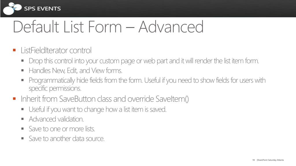 Default List Form – Advanced • ListFieldIterator control • Drop this control into your custom page or web part and it will render the list item form. • Handles New, Edit, and View forms. • Programmatically hide fields from the form. Useful if you need to show fields for users with specific permissions. • Inherit from SaveButton class and override SaveItem() • Useful if you want to change how a list item is saved. • Advanced validation. • Save to one or more lists. • Save to another data source.
