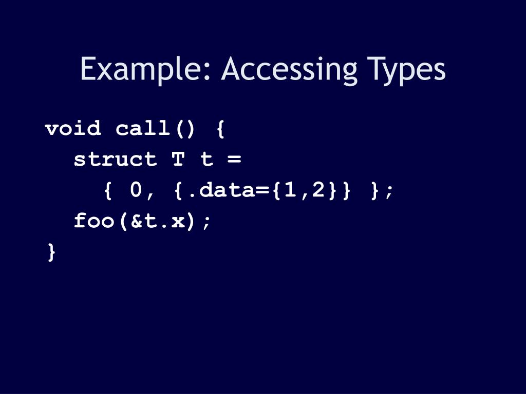 Example: Accessing Types void call() { struct T t = { 0, {.data={1,2}} }; foo(&t.x); }