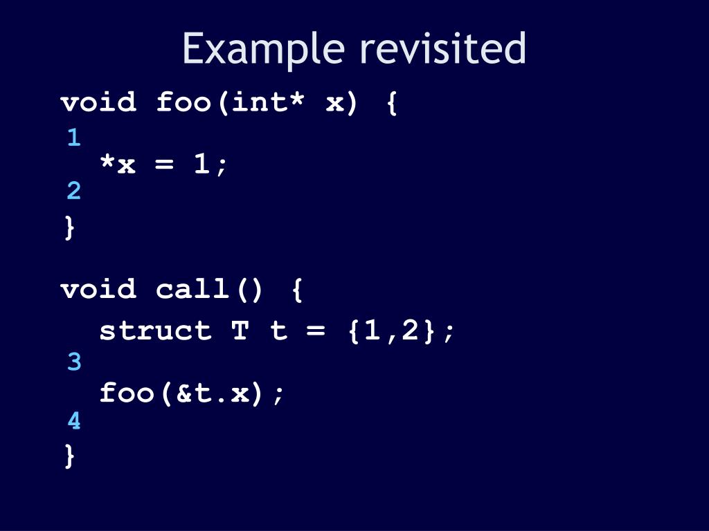 Example revisited 1 void foo(int* x) { *x = 1; } void call() { struct T t = {1,2}; foo(&t.x); } 2 3 4