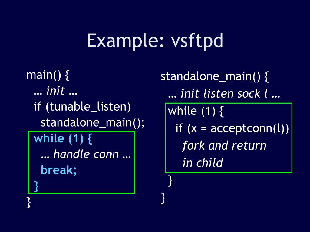 main() { … init … if (tunable_listen) standalone_main(); while (1) { … handle conn … break; } } standalone_main() { … init listen sock l … while (1) { if (x = acceptconn(l)) fork and return in child } } Example: vsftpd