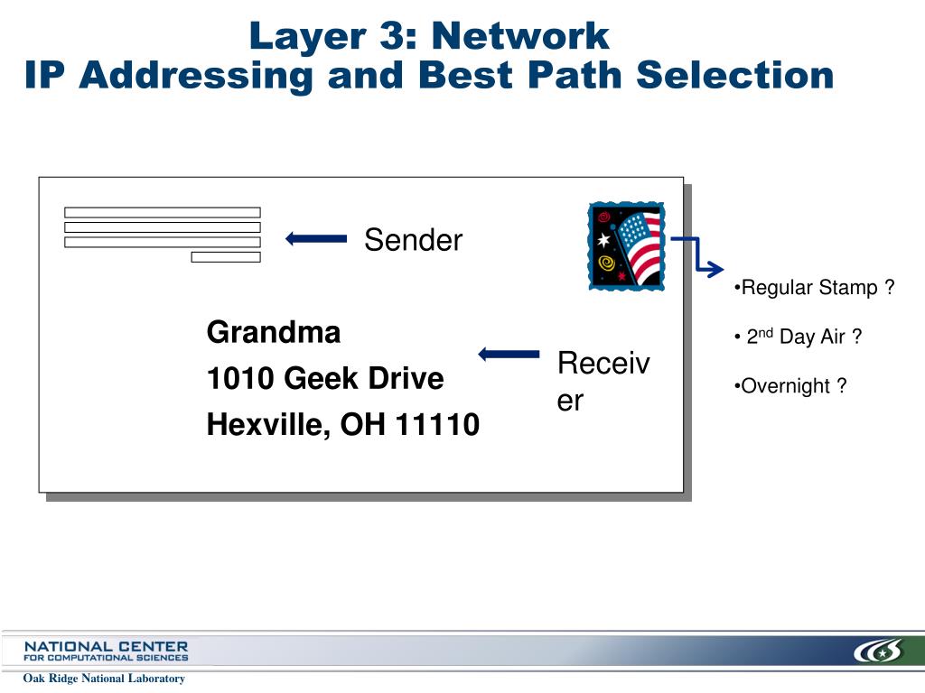 Layer 3: NetworkIP Addressing and Best Path Selection Grandma 1010 Geek Drive Hexville, OH 11110 Sender • Regular Stamp ? • 2nd Day Air ? • Overnight ? Receiver