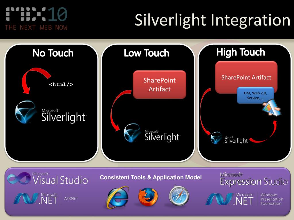 Silverlight Integration High Touch No Touch Low Touch SharePoint Artifact SharePoint Artifact <html/> OM, Web 2.0, Service, … Consistent Tools & Application Model