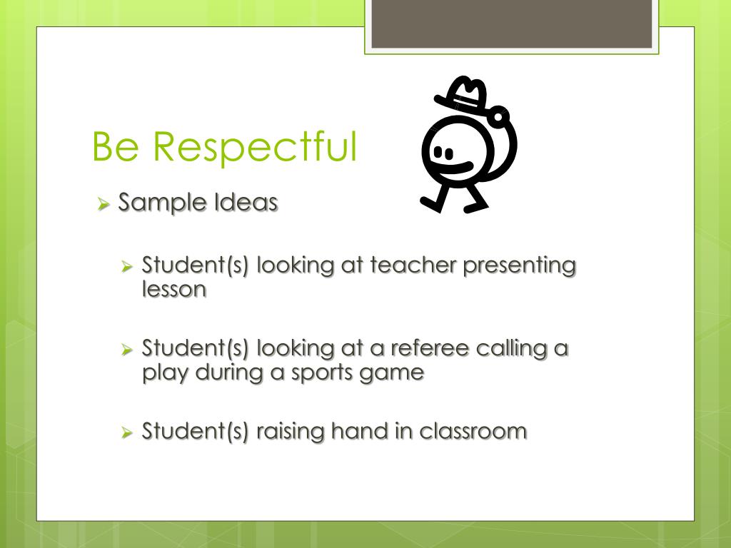Be Respectful • Sample Ideas • Student(s) looking at teacher presenting lesson • Student(s) looking at a referee calling a play during a sports game • Student(s) raising hand in classroom