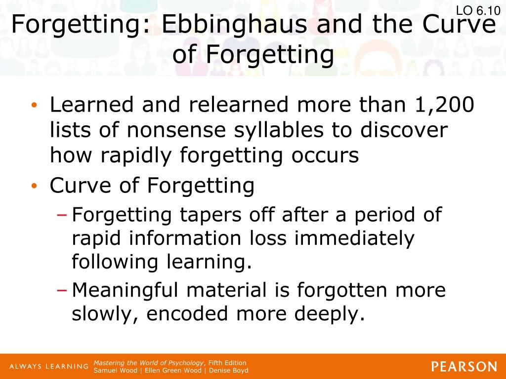 Forgetting: Ebbinghaus and the Curve of Forgetting LO 6.10 • Learned and relearned more than 1,200 lists of nonsense syllables to discover how rapidly forgetting occurs • Curve of Forgetting • Forgetting tapers off after a period of rapid information loss immediately following learning. • Meaningful material is forgotten more slowly, encoded more deeply.