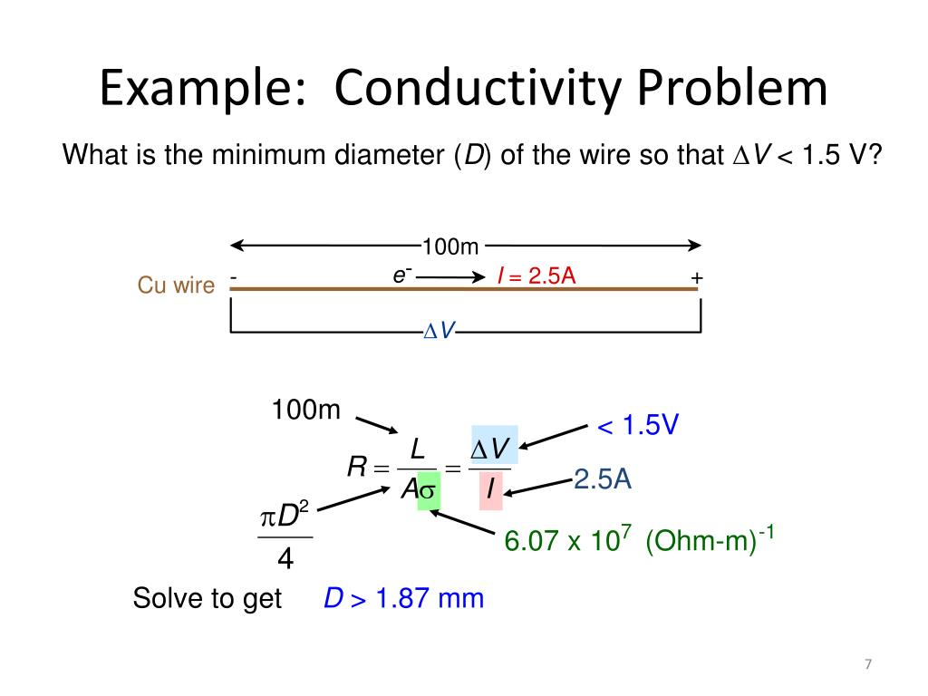 Example: Conductivity Problem 100m < 1.5V 2.5A 7 -1 6.07 x 10 (Ohm-m) What is the minimum diameter (D) of the wire so that DV < 1.5 V? 100m - e I = 2.5A + - Cu wire DV Solve to get D > 1.87 mm