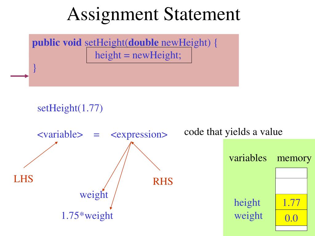 LHS RHS newHeight 0 1.77 weight 1.77 1.75*weight Assignment Statement publicvoid setHeight(double newHeight) { height = newHeight; } setHeight(1.77) code that yields a value <variable> = <expression> variables memory height 0 weight 0.0